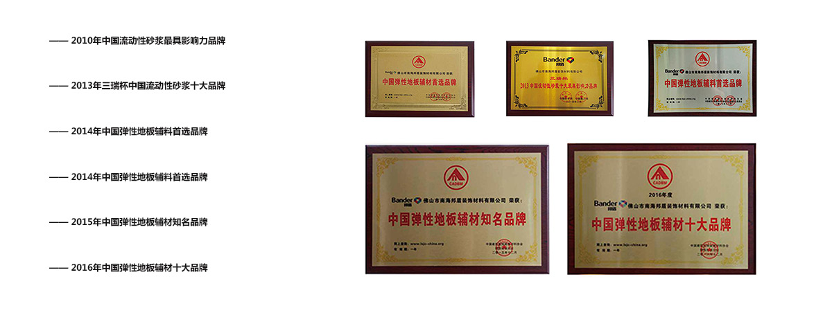 邦盾荣获《中国弹性地板辅料首选品牌》以及《2013中国流动性砂浆十大最具影响力品牌》殊荣。